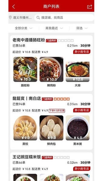 3、直接定位附近的美食配送商店就能找到自己爱吃的食物。