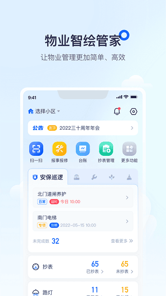 绘管家app是专门为物业行业定制的综合管理应用,全方面覆盖物业管理的方方面面,房屋信息、车辆档案、水表数据等等全都可以随时查询到,实现智能化巡检,轻松完成物业管理的任务。
