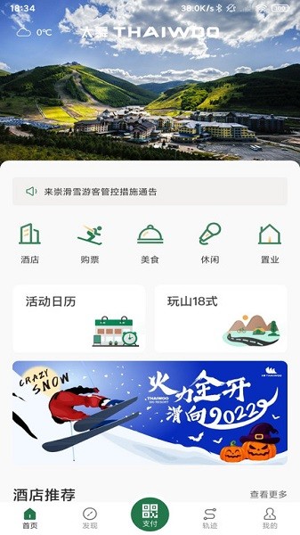 太舞小镇App是太舞小镇度假区官方推出的手机应用。为您提供在线预订酒店、购买雪票,查询小镇内餐厅、休闲、购物等服务,也为您提供小镇的天气&雪况、游玩攻略、热门活动、交通指引等信息。