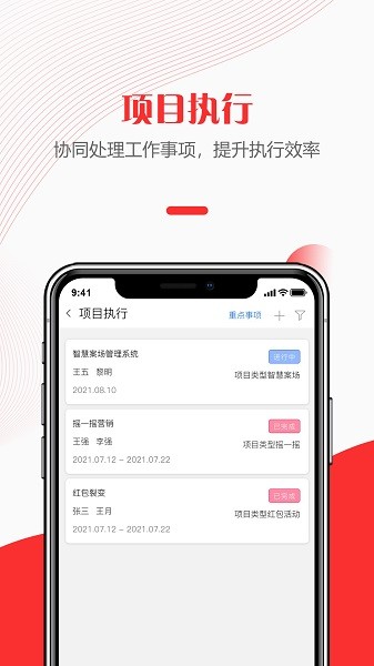 【项目执行】根据不同岗位不同权限,可在移动设备中处理负责项目的工作进度,按流程跟进工作进度,提升工作效率。
