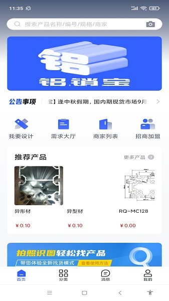 铝销宝app是一款专为铝制品行业打造的手机软件,在这里能够快捷进行铝制品的销售购买。多种类商品,产品十分的齐全。可以根据识图进行购买,非常便捷。需要的用户赶紧看看吧!