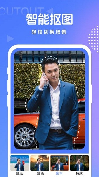 支持抠图切换背景,一键完成抠图,并选择喜欢的背景图完成设置