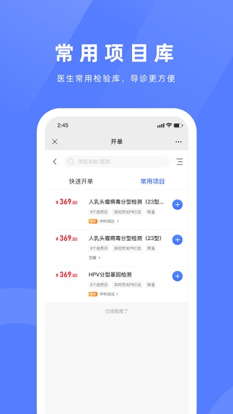 通过整合当地中心医院检验科和全国知名的独立第三方医学实验室,全面赋能临床医生,为医生提供平台型全流程标准化的检验服务,覆盖常见病、慢性病、精准检验等3000多种临床检验项目,实现医生手机移动开单;同时,工作站内的医教内容和智能AI辅助开单功能,提升他们的医技检查范围和诊断精准度,提升临床诊疗能力,面向医生使用的手机工作站。