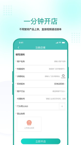 商家只需一分钟即可完成注册上线,不用上产品即可完成在线视频接单与服务,实现网络化、数字化、可视化、简易化经营升级