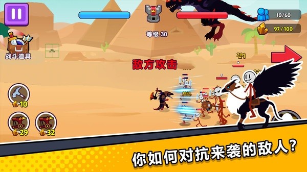 你有幸成为一支军队的指挥官。开局用仅有的矿工进行采矿,用获得的紫晶矿来训练你需要的兵种。剑士、弓箭手、巨人等,运用合理的搭配兵种来与敌方进行战斗。 在进退有限的空间里,攻下敌人的城堡就可获得胜利。在关键时候利用指挥官技能能够更好地打败对手。