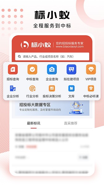 标小蚁app能够帮助用户随时查询招投标信息,来自全国各地的相关数据都会实时更新,为你智能化分析所有项目的优缺点,标书服务、工程预算等等多项功能带来了极高的效率。