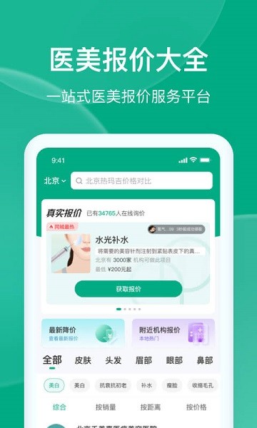 医美报价大全,一站式医美报价服务平台,提供医美品类的真实价格查询,用户可按机构,按品类,按距离,查询真实商品报价,并支持用户查验医院营业执照,医院医生资质等。