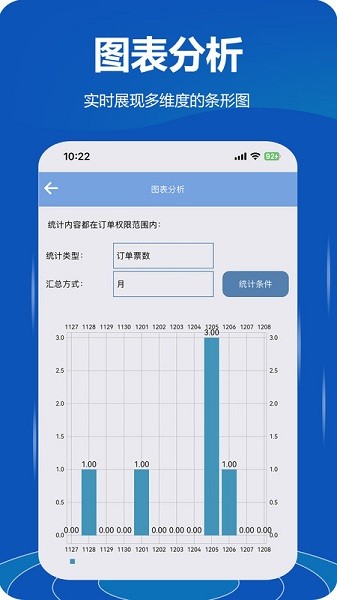 按日、月、年,统计订单的票数、开票金额、到账金额,并通过柱状图进行展现。