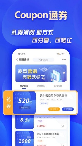 打造了一个集吃购娱为一体的通券、礼券购买平台,基于coupon商盟的商家网络,同时,礼券通过自主专利技术“短信二维码”呈现,使客户信息更安全,码化云是一个吃喝玩乐都能使用的软件,为客户提供低成本、更便捷、选择多样化的礼券产品,可拆分可转让,使用更方便。