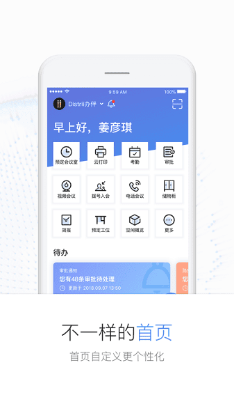 distrii办伴app沿用领先技术打造而成,实现智能化办公,简约界面设计,丰富功能服务,满足企业办公的各项需求,综合性高,能够帮助用户提供办公效率。