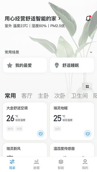 专业舒适家控制管理APP,通过APP可以实现中央空调、地暖、新风等系统的互联互通,协调工作,达到舒适、节能、健康的居家环境。