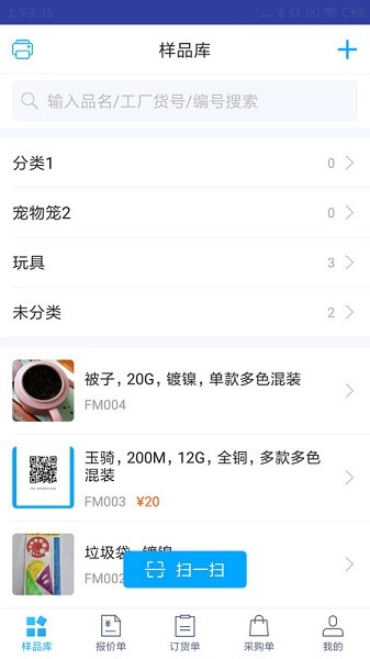 店面高效管理,将外贸公司所需的样品信息都统一录入在 APP 样品库里,终以单产品二维码形式贴在样品上,外贸公司通过 扫描二维码快捷提取产品基本信息(含图片信息)。