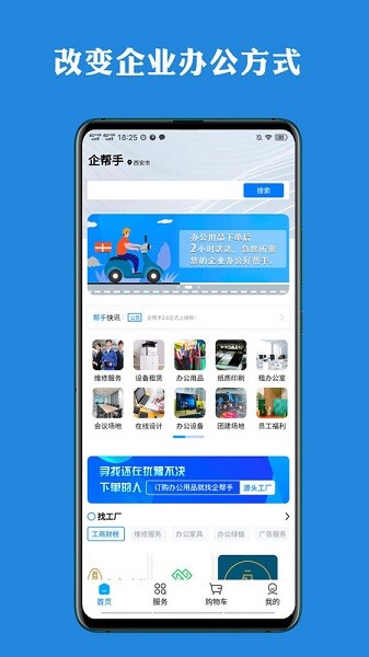 企帮手app的出现大大改变了企业传统办公服务流程,能够满足全生命周期过程的所有需求,设备购买租赁、办公用品、服务商验证入驻等等,为企业带来的便捷高效化的综合服务。