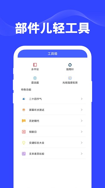 部件儿轻工具app将生活中常用的功能整合,包括水平仪、指南针、节气、倒数日等等,体积小巧,使用简单直观,任何用户都可以轻松上手,一个app解决你的所有需求。