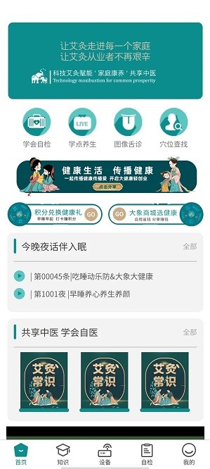 做健康幸福的一家人。7天健康打卡,养成早睡早起好习惯,受益以健康生活,有了好习惯,才有好身体。在线健康检测参考,通过好习惯、坏习惯、身体语言,总结自身,明确调理身体方向,象艾益家APP,随时随地学习中医穴位、经络,学习艾灸等自然养生方法,早学习,早认知,早调理,以更健康的生活。