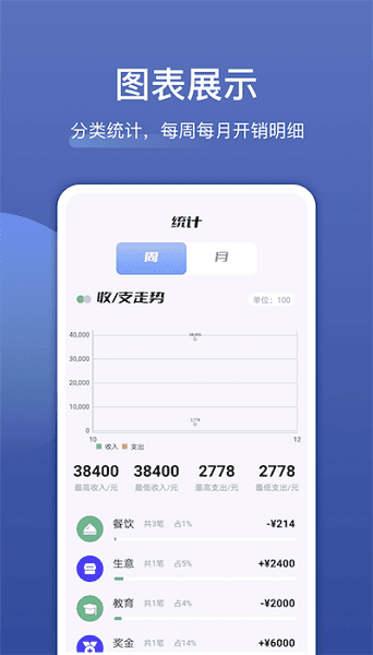轻松的图表展示统计了不同时间段自己的具体消费金额情况说明,简单直观的完成消费的分类说明和使用模式,更加容易完成生活的记账。