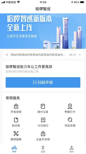 哈啰智巡app是哈啰工作人员用于线上办公的首选,支持常用服务包括骑行记录、考勤打卡、车辆寻找、维保报障等等,大大提升工作人员的效率,让城市生活更为智能。