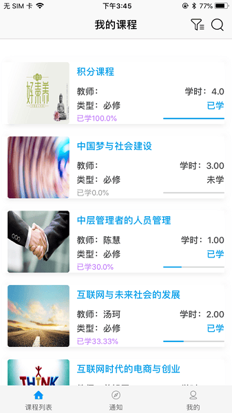 查看我的课程,了解课程教师、类型、学时、已学等信息情况;