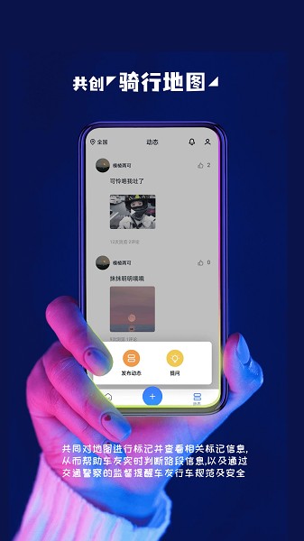 骑行地图,通过共创的形式,车友们可以共同对地图进行标记并查看相关标记点信息,从而帮助车友实时判断路况信息,以及通过交通警察的监督提醒车友注意行车安全