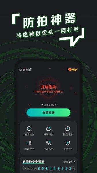 防拍神器APP是一款保护隐私的生活小工具,强大的数据挖掘技术,可以供您参考,将所有隐藏的网络摄像头一网打尽。一键检测、快速分析,您手机上的防偷拍专家,保护您的出行住宿隐私安全。