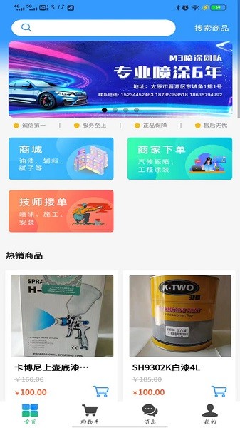 主要功能是涂料销售、喷涂加工等。分为商城、商家发单、技师接单几个模块。