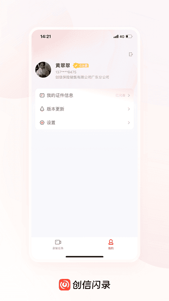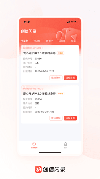 创信闪录app针对保险代理人的需求打造的,作为一款智能保险双录应用,它大大简化录制流程,有着完善的功能支持,所有任务的信息一览无余,带来便捷使用体验。