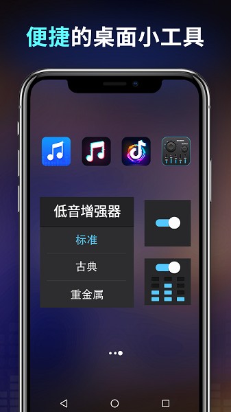 运行低音增强器应用程序,设置音量、均衡器,放置后台运行,便可体验美妙动听的音乐