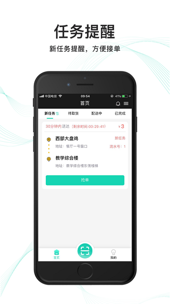 为校园内骑手量身打造的app,人人都可成为骑手,开启配送生活。新任务实时推送,抢单,取货,配送,入柜。仅需四步即可完成订单。方便快捷。