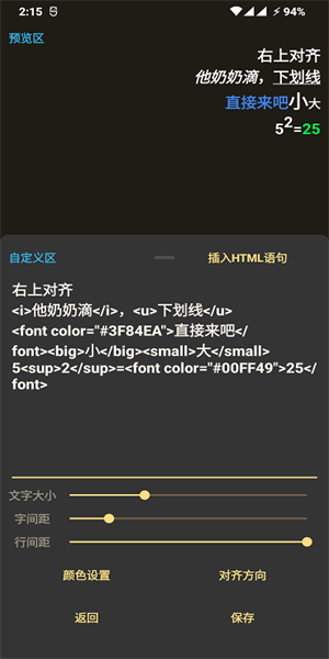 支持使用HTML标签,为某段文字添加粗体、斜体、下划线、中划线、颜色、上半格显示、下半格显示、加大、减小字体的属性(属性可以任意叠加)