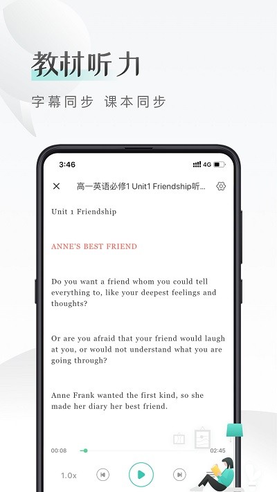 教材听力:精选初中到高中的课本英语听力,每章节均带有字幕,同步课本练习,反复听。