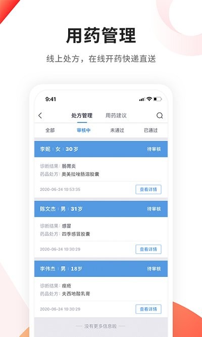 管理自己的病人,帮助医生与病人进行联系,致力于打造一个全面的,方便的就医平台。可以在线与患者进行沟通,帮助患者进行问诊,在线开药,每一个患者的信息都会详细的进行记录。