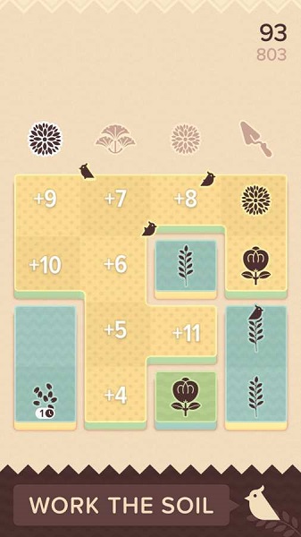 游戏的步骤很少,把一些相同的植物放在一起,当出现铲子时,你可以翻动相连的同种植物的土壤使他们改变颜色