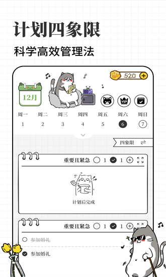 是一款记录计划待办、规划日程安排、管理每天行程计划的效率专注类实用工具,各种各样可爱的小喵咪陪你做计划、专注、倒数,让每天变得有趣,让自己变得优秀。